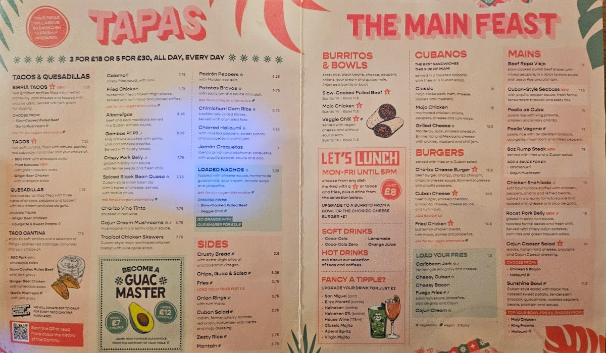 The menu at Revolución De Cuba Harrogate is a delightful journey through Cuban cuisine, offering a range of dishes that are both bold and flavorful. From savory tapas to hearty mains, the menu showcases a variety of options that cater to all tastes. Standout dishes include the slow-cooked Cuban pork, which is tender and packed with flavor, and the signature Cuban sandwiches that deliver an authentic taste of Havana. The use of fresh ingredients and rich spices ensures that each dish offers a true reflection of Cuban culinary traditions.